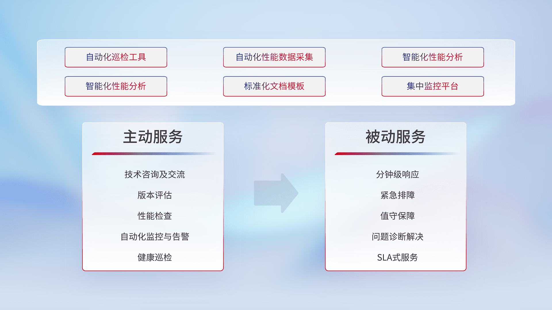 智能化工具和标准化文档,,保障服务质量,,,,提供主动服务(包含技术咨询、、版本评估、、性能检查、、自动化监控与告警、、、健康巡检)和被动服务包含(分钟级响应、、紧急排障、、、、值守保障、、、问题诊断解决、、、SLA服务)。。。
